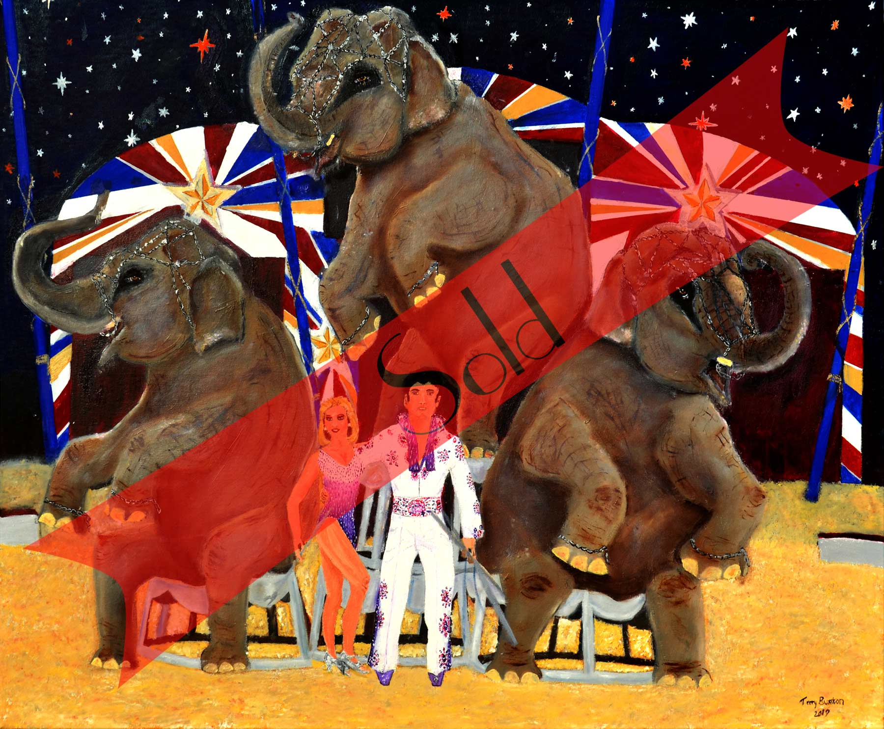 Billy & Ingrid Smart with their trio of elephants in 1990. This oil painting as now been sold.
